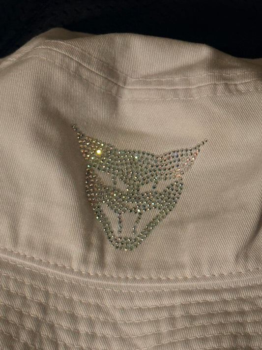 Faded light blue denim y2k bedazzle clear gem cat head bucket hat