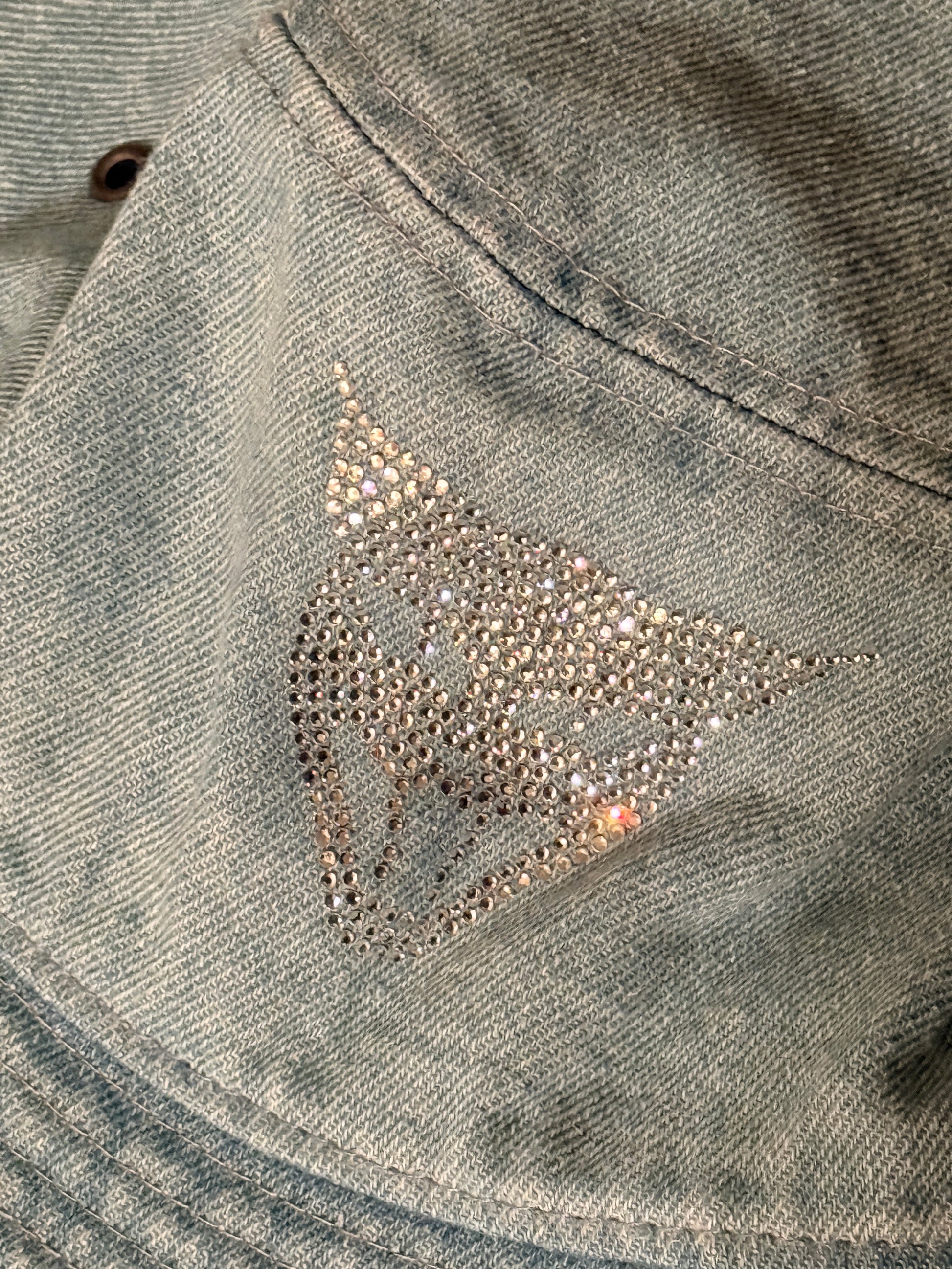 100% cotton faded light blue denim bucket hat with clear gem bedazzle cat head. Was really trying to capture a Britney Spears Justin Timberlake moment with this one. Size L/XL. Only one available.