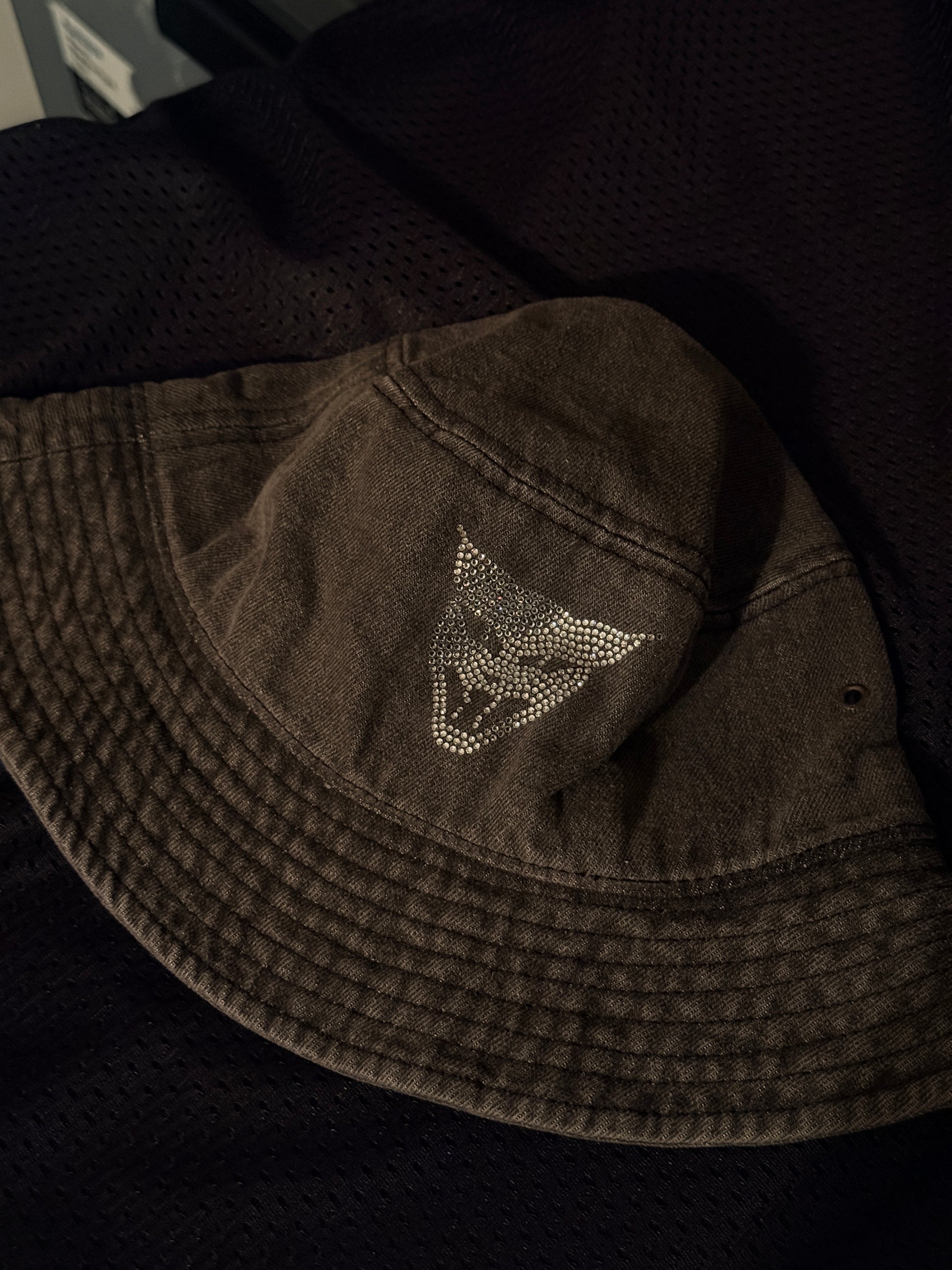 100% cotton faded vintage black bucket hat with clear gem cat head. Size L/XL. Only one available.