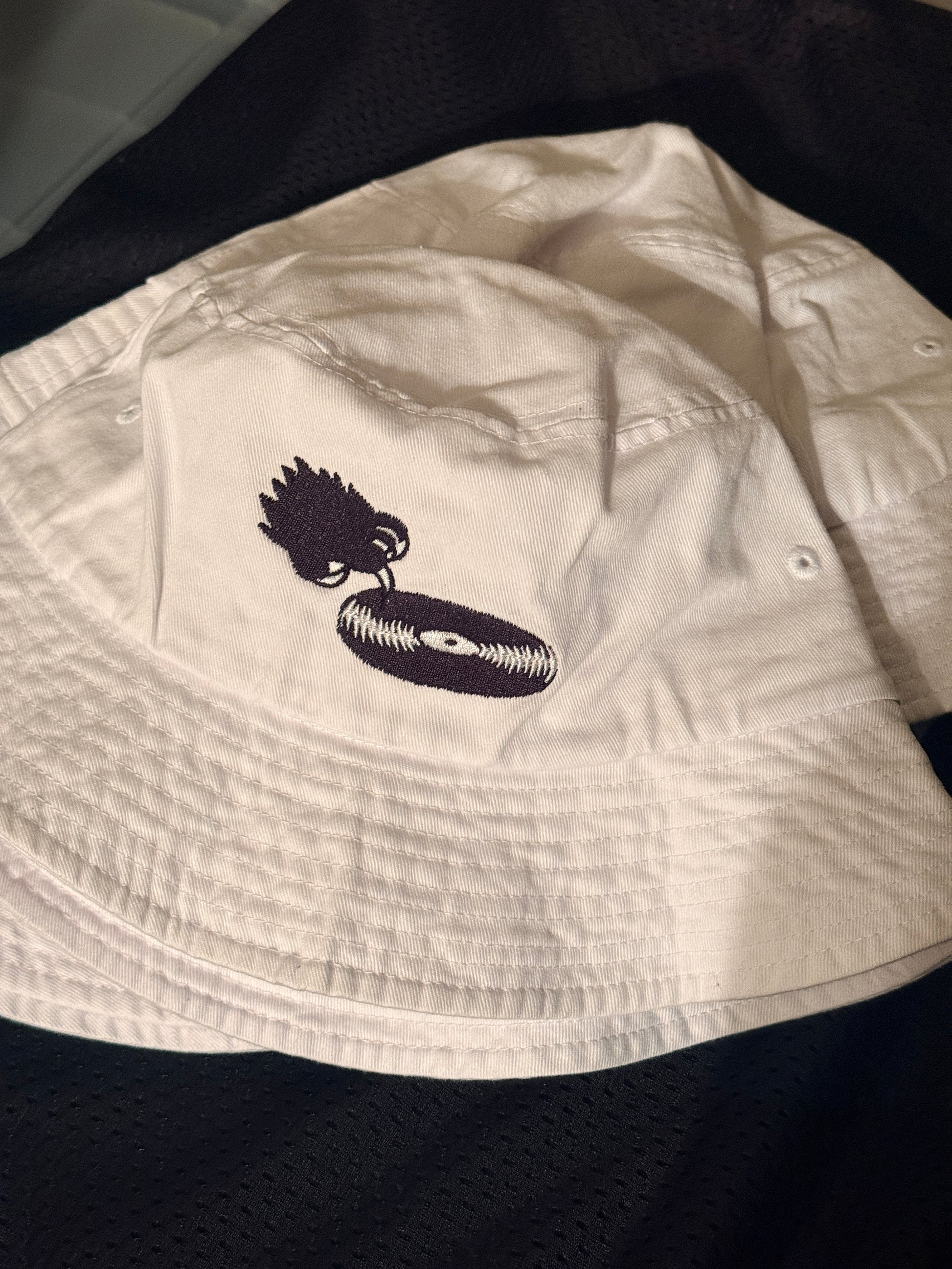 100% cotton white bucket hat with record scratch embroidery. One size fits all.